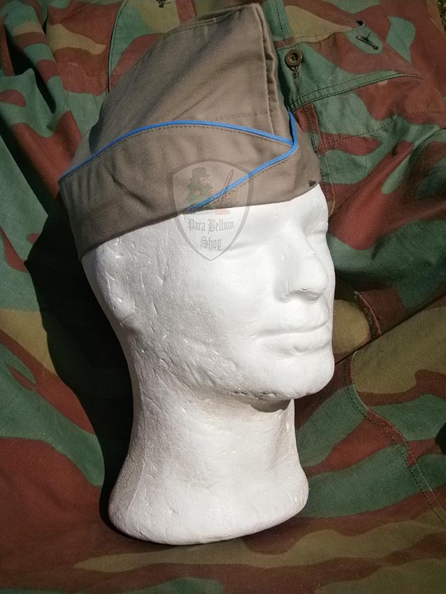 Riproduzione della bustina americana, Garrison Cap, utilizzata dagli uomini dello US Army durante la seconda guerra mondiale, nella versione khaki in dotazione agli uomini della fantaria, caratterizzata dal cordoncino azzurro.