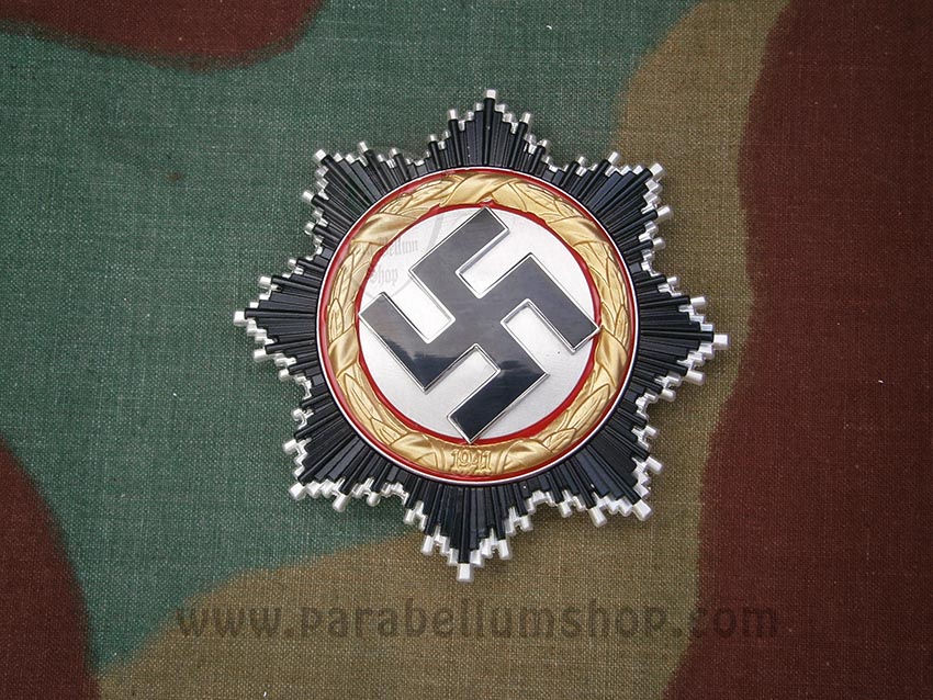 Riproduzione di ottima qualità della Croce di Germania in oro, Kreigsorder Des Deutschen Kreuzen, creata il 28 settembre 1941 da Adolf Hitler spinto anche dalla campagna nell’Est in corso. La croce aveva lo scopo di premiare i soldati che si erano distinti per valore e coraggio sul campo di battaglia essendo protagonisti di azioni che erano ben più meritevoli di quanto la Croce di Ferro di I^ classe premiasse ma che al contempo non fossero sufficienti per una Croce di Cavaliere della Croce di Ferro. L’assegnazione poteva avvenire per ogni grado quindi truppa, sottufficiali e ufficiali e il requisito precedente era quello di essere già in possesso della Croce di Ferro di I^cl e di II^cl. anche nella versione di riconferma di quella della Prima Guerra Mondiale. La dimostrazione sul campo di battaglia di eccezionali doti di comando delle truppe erano un altra motivo di assegnazione. Una decorazione che era separata dalla Croce di Cavaliere e che poteva essere conferita anche avendo già ricevuto tale decorazione.