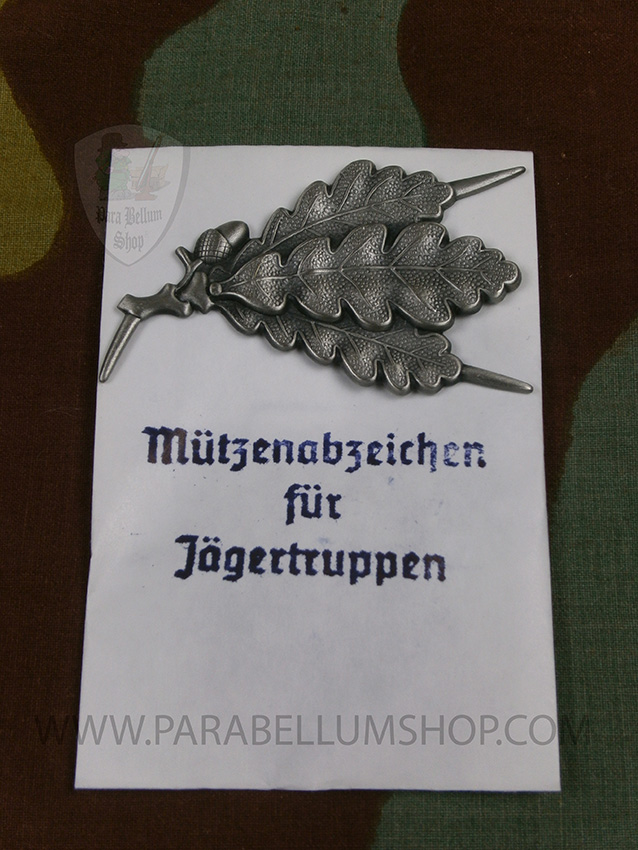 Riproduzione delle foglie di quercia delle jagertruppe, nel modello utilizzato durate la Seconda Guerra Mondiale ed acquistabile presso i noti magazzini Heeres Kleiderkasse, il prestigiosissimo magazzino di vestiario di alta qualità della Wehrmacht sito a Berlino. Realizzata in metallo e da applicare sul cappello dei cacciatori, le truppe di fanteria leggera della Wehrmacht. Applicata sul lato sinistro del feldmutze per mezzo di tre ardiglioni ripiegabili.
