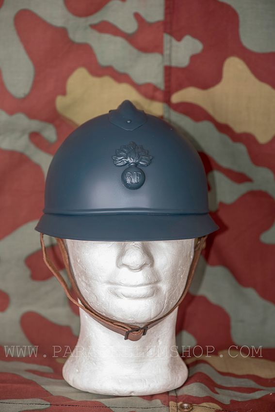 Riproduzione dell’elmetto francese Adrian M16 il modello impiegato durante la Prima Guerra mondiale come prima risposta alla necessità di proteggere le teste dei soldati nella prima guerra moderna. Lo stesso modello sarà esportato verso altri paesi tra i quali anche il Regno d’Italia ne adotterà un modello di produzione nazionale. L’elmetto è verniciato e dotato di sottogola e interno in pelle.