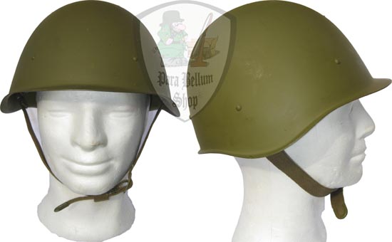 Elmetto sovietico originale modello ssh40 utilizzato durante il secondo conflitto mondiale dall’esercito russo dell’Armata Rossa. L’interno è costituito da 3 cuscinetti in pelle imbottiti e da un cordino che regola la profondita di inserimento della testa. Il sottogola è una cinghia in canapa in due pezzi regolabile per mezzo di una fibbietta scorrevole.