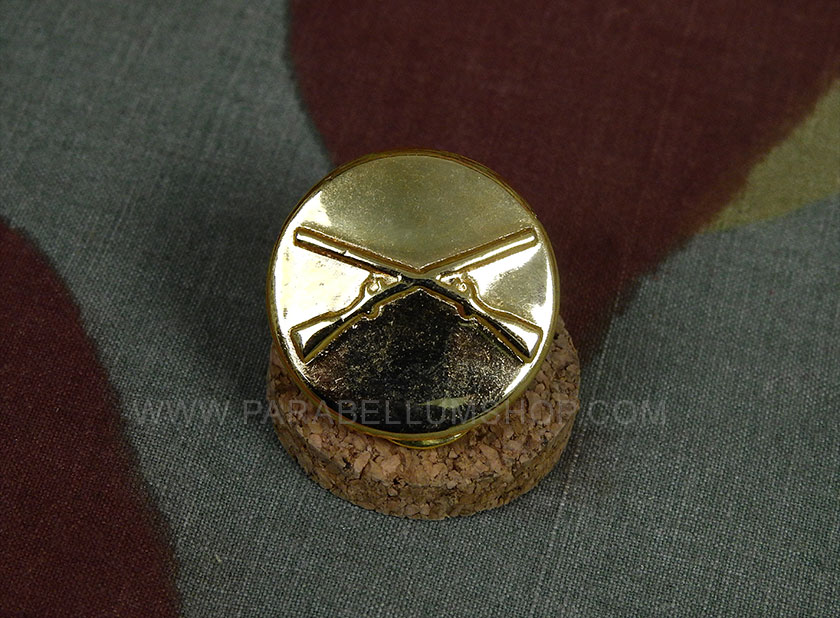Riproduzione del disco da colletto per truppa delle unità di fanteria dello US Army durante la Seconda Guerra Mondiale, costituito da due fucili incrociati su di un disco.