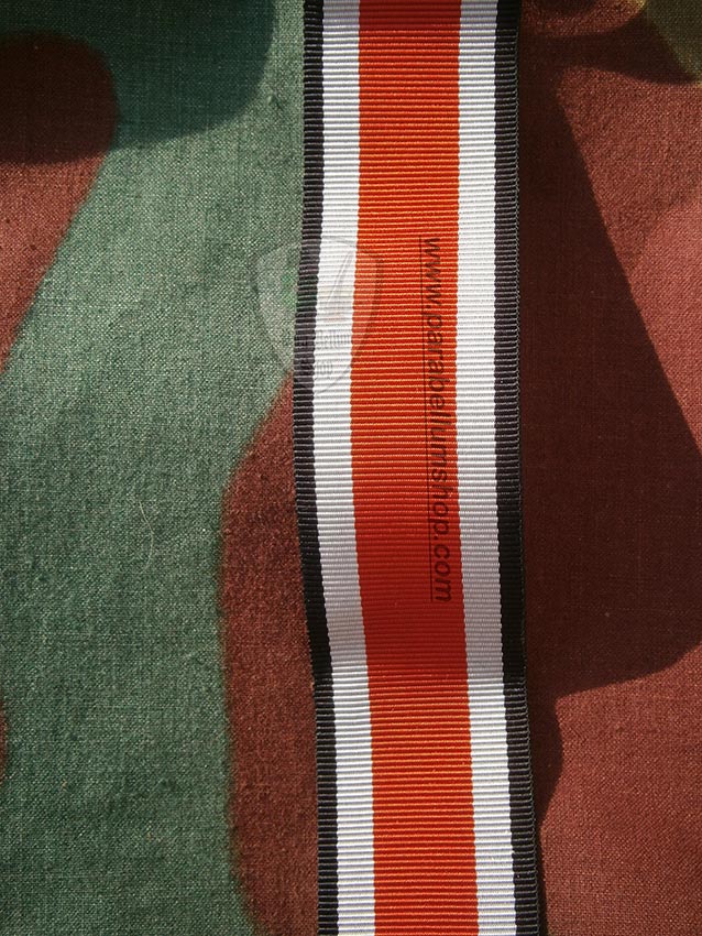 Riproduzione del nastrino della Croce di Ferro di II classe reintrodotta nella nuova versione il 01 settembre 1939 per ogni rango e grado della Wehrmacht. Il conferimento della Croce di Ferro di II cl. era conseguente ad un singolo atto di coraggio o azioni che superassero ogni aspettativa e talvolta veniva assegnata anche collettivamente. Il nastrino si indossava sulla seconda asola della giacca. Larghezza 3 cm.