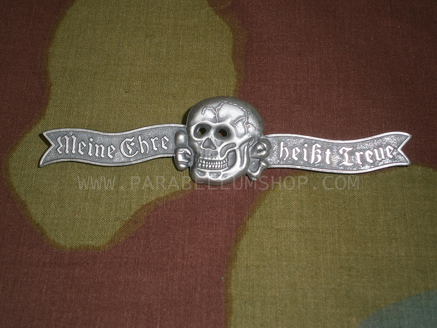 La spilla realizzata per essere indossata sulla giacca dell’uniforme di gala delle Waffen SS da applicare sul lato destro della giacca. La spilla riporta su di un nastro il motto delle Waffen SS: meine ehre heist treue. Al centro della scritta il teschio simbolo delle Waffen SS. Sul retro è riportato il marchio RZM che riunisce i fornitori ufficiali e il numero di serie. Uno dei più noti possessori di questa spilla fu Von Ribbentrop.