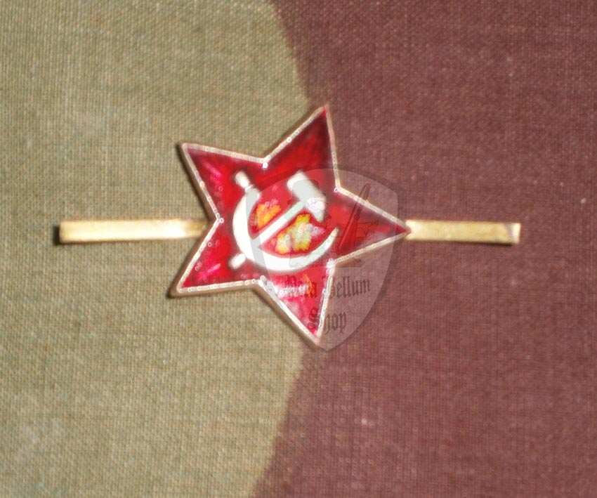 Riproduzione della stella in metallo smaltata di rosso con falce e martello che veniva applicata sulle bustine dell’Armata Rossa durante la Seconda Guerra Mondiale. Sul retro due fermagli in metallo assicurano il bloccaggio del distintivo sulla bustina.