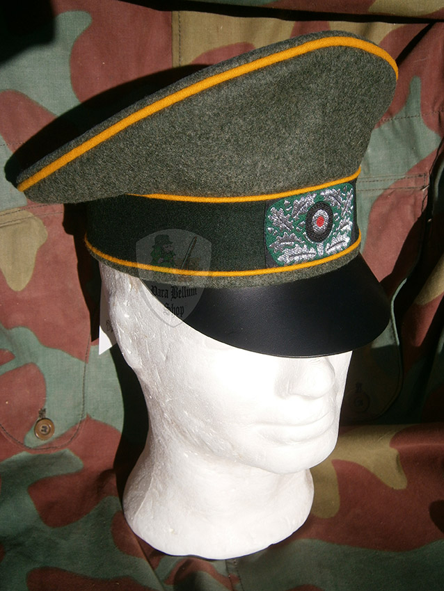 Called as officer old style cap, looks at first sight to Schirmmütze but at a depth analyzes it differed in several detail. It was not provided with the silver cord, the top appeared collapsed for lack of a rib system. The tricolor cockade and wreath of oak leaves were on the BEVo type silver silk sewn on the green-blue color range, while the Nazi eagle always in BEVo silver thread sewn up. The soft black leather visor. Although its use would have to cease with the April 1, 1942, its use was so popular that it continued until the end of the conflict.