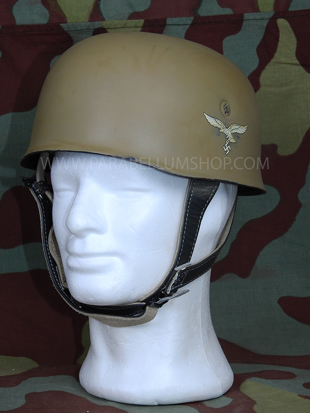 Sent to fight in North Africa as an elite unit, the Fallschirmjager adapted their jump helmets to the conditions of the front in the most varied ways conditioned by the material available at the moment, ranging from beige/brown paint to the use of natural products like mud dried on the shell. In any case, the helmets kept the factory configuration with the color blaugrau, Luftwaffe eagle and/or tricolor shield under the makeshift camouflage. These in different ways were covered by the paint, made to re-emerge by scratching the paint or saving the shape. The same helmets and techniques were employed in the Italian operational theater.