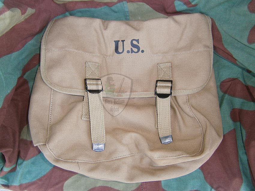 Reproduction of the breadbag M 1936. It was equip for all airborne troops of the army of the US Army, during the second world war. Contained material for personal hygiene, various rations, cap, spoon and spare biancheri. It Has two front closure by straps and little buckles, two shoulder straps with hooks for engaging with upper and lower two rings for engagement below, one side and one rear pocket. The Interior is partitioning, in various spaces exactly like the originals. There are also U.S. prints on the front and SEMS 1943 on the inside of the battola.
