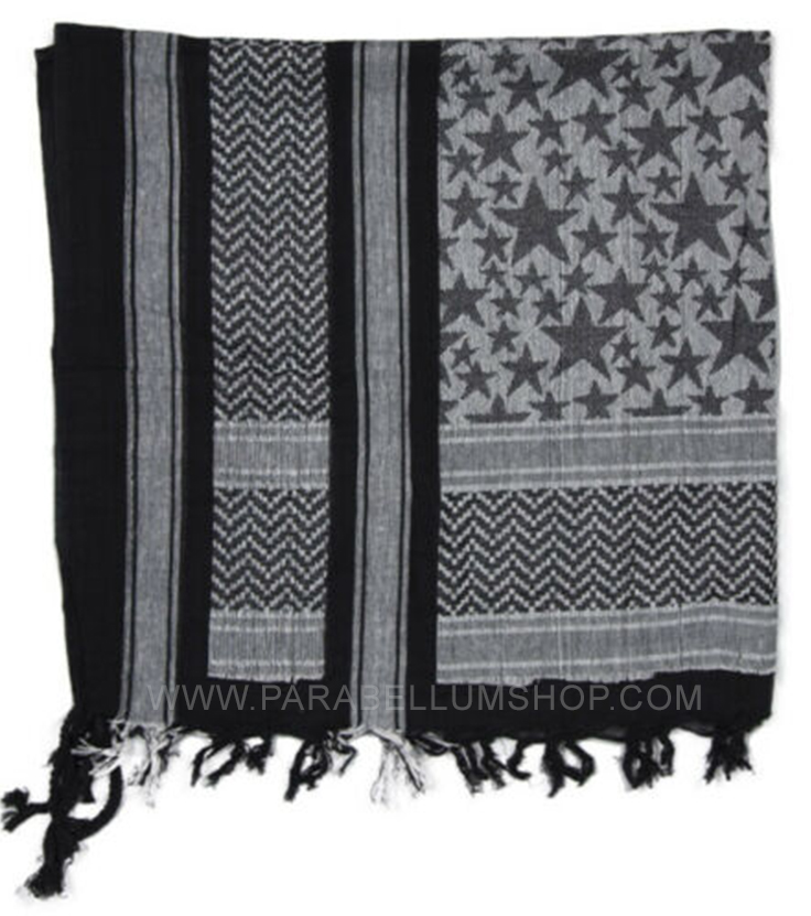 Scarf/shawl kefiah type decorated with a stars motif.Scarf of Arab origin and originally designed to provide protection in the deserts against the sun, wind, sand and at night from the cold. Used by military from all the world, it is also excellent for airsoft, hiking, traveling or any other outdoor use. Used for the first time by British special forces in North Africa during the Second World War, it is currently supplied to the British army and others throughout the world. Highly versatile it can be worn in many ways: headgear, veil for the face, scarf, protection from the sun.